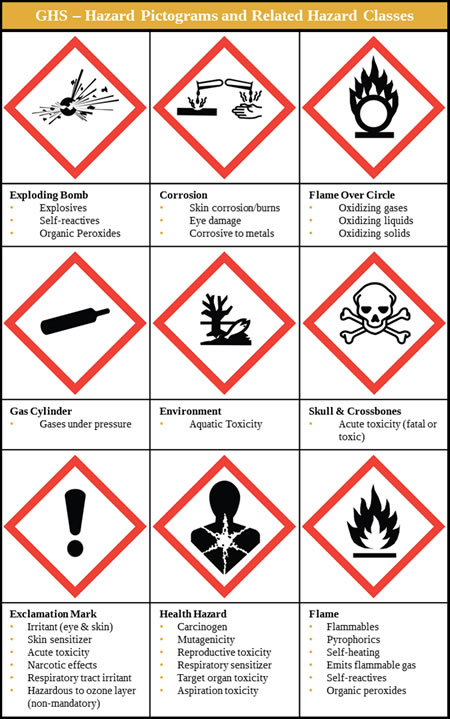 - Pictogramas comunicarán cualquier peligro a la salud, físico y ambiental cuales sean asignados a una categoria de GHS.